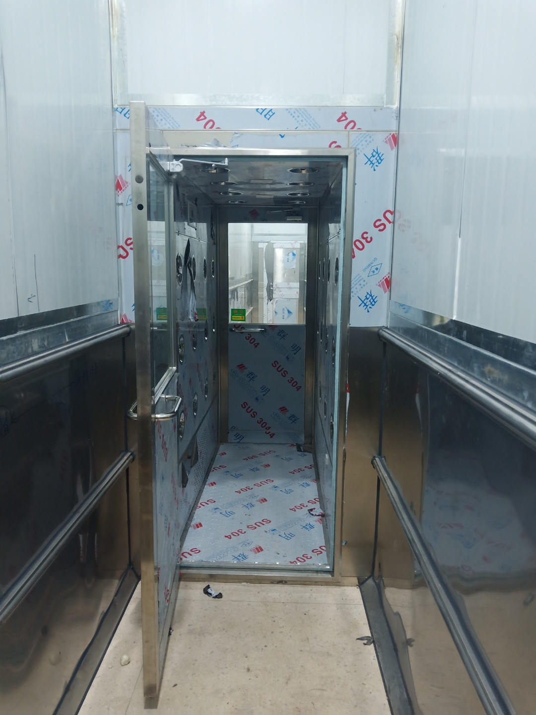 3、如果走廊位置比較緊湊,這種風淋室在測量現場的時候尤其需要注意。尤其是鈑金型風淋室,因為尺寸要求較高,我們在測量的時候應該多選幾個點進行測量。前后測量,其次由于土建墻存在偏差,我們需要對土建墻的高低進行測量。最后取最小值,以免風淋尺寸過大而無法安裝進去。